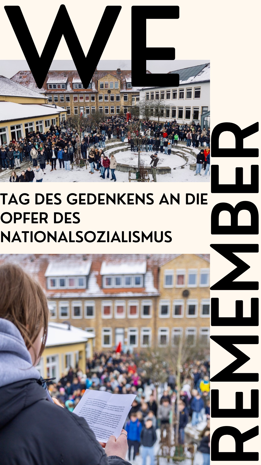 Ihnen an diesem Tag zu gedenken und das Leiden nicht vergessen zu lassen, ist heute ebenso unser Anspruch wie hieraus ableitend Verantwortung für uns und unsere Umwelt zu übernehmen. Die Zeit heute ist nicht vergleichbar mit der Zeit des Nationalsozialismus oder den letzten Jahren der Weimarer Republik. Doch sich gegen menschenverachtende Ideologie(n) einzusetzen und solidarisch miteinander zu sein, ist sicherlich eine Lehre aus der Geschichte und eine Einstellung, die wir heute als Schulgemeinschaft aus der Gedenkveranstaltung ziehen.