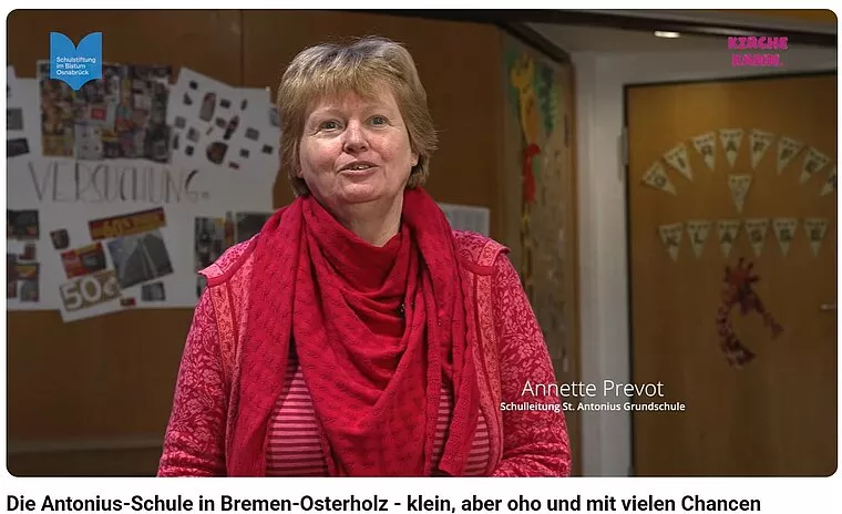 Rund 100 Schüler in vier Klassen: Das ist die katholische St. Antoniusschule im Stadtteil Osterholz im Südosten Bremens. Die Schülerin Luisa und Schulleiterin Annette Prevot stellen die Grundschule in einem Video vor. Die Schulleiterin berichtet über die großen Chancen, besonders auf die Kinder einzugehen, über das individuelle Fördern und Fordern – und über das, was die Kinder brauchen. Außerdem spricht sie über ein völlig neues Lernraumzonenkonzept. Annette Prevot erklärt auch, warum es wichtig ist, auf die Bedürfnisse der Eltern einzugehen. Und Luisa erzählt, wo sie sich gerne in der Pause aufhält und präsentiert einen besonderen Parcours.