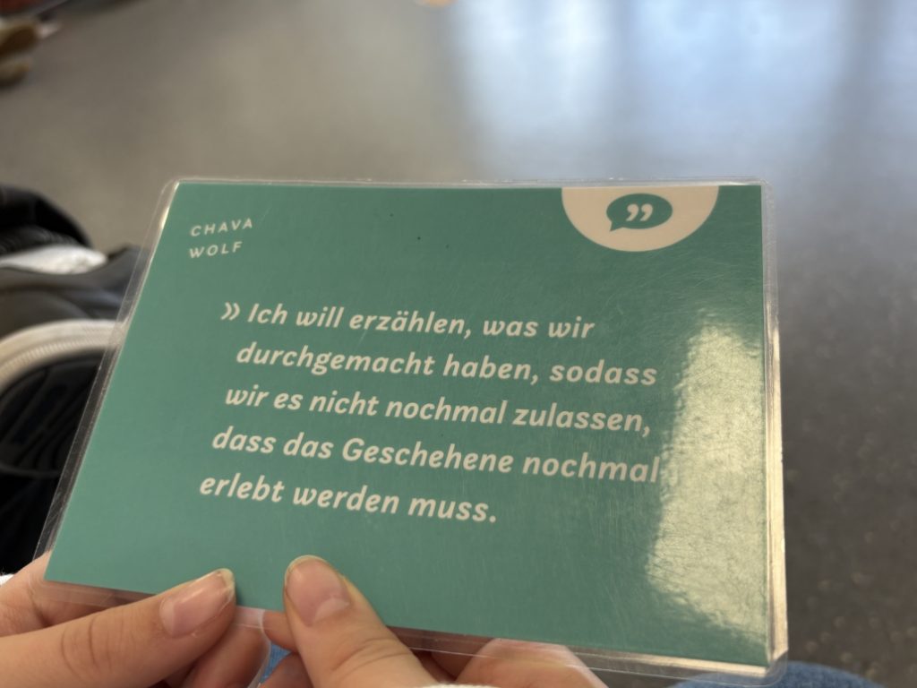 - Liah: „Ich fand die Zweitzeug*innen richtig toll, da ich jetzt mehr Leuten von der Geschichte erzählen kann und weil ich neue Sachen gelernt habe – z. B., dass Jüdinnen und Juden in der Nazizeit mehr als 2000 Gesetze zu befolgen hatten.“