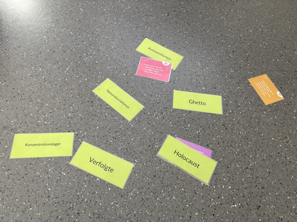 Dies gelang in den Workshops an der TMS besonders gut, weil Rebecca Reusch gemeinsam mit unseren Schüler*inneneine Verbindung zu ihren eigenen Lebenswelten herstellte. Nach einer kurzen, altersgerechten Einführung in die Zeit des Nationalsozialismus erstellten Rebecca und die Schüler*innen gemeinsam Stichpunkte zu ihrem typischen Tagesablauf: vom Aufstehen über Schule, Mahlzeiten, Freizeit und Hobbys bis zum Schlafengehen. Anschließend durfte sich jede*r eine am Boden liegende Karte nehmen. Auf diesen Karten standen die Verbote, die Jüdinnen und Juden zwischen 1933 und 1945 zu befolgen hatten – etwa, dass sie kein Fahrrad mehr besitzen, keine Schule mehr besuchen oder kein Haustier mehr halten durften.